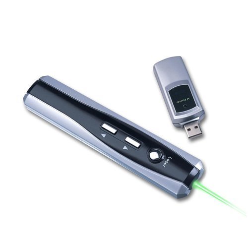 RF Wireless Green Laser Pointer 5mw with Page Up/down Presentation Function-Green Laser. This high powered RF wireless Green Laser Presenter is suitable for teaching, meetings, speeches, training and so much more. Built-in Green 5mw Green Laser Pointer and full wireless remote runs on two (2) AAA batteries for over 3-4 hours of continuous use! Remote functions are page up and page down. USB plug in and play, No need to install software. Simply plug the receiver into the USB and then you are ready to give your presentation using the buttons on the pointer unit. We offer the best price on the web for a green laser wireless RF Presenter! It allows you to present your slides or items remotely without having to use a mouse or tap the keyboard. Control distance is over 50ft. Works with Powerpoint, Adobe, Word." * Operating system: Windows 98/ME/2000/XP, Mac OS 10.4 or earlier, will not work with 10.5 or newer!/Vista